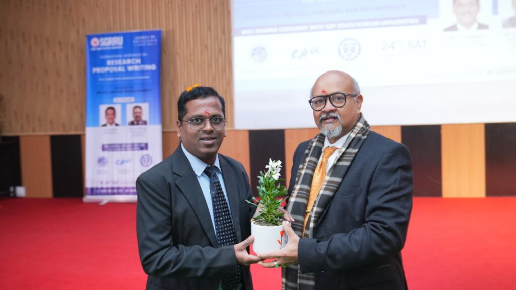 वहीं डॉ. एस. के वार्ष्णेय ने सफल शोध प्रस्ताव लेखन की प्रक्रिया, प्रस्तावों की अस्वीकृति के सामान्य कारणों तथा वित्तपोषण एजेंसियों की अपेक्षाओं पर विस्तृत जानकारी दी। उन्होंने शोध प्रस्तावों में स्पष्टता, मौलिकता, व्यवहार्यता और उद्देश्यपरक दृष्टिकोण को अत्यंत आवश्यक बताया तथा प्रतिभागियों को प्रतिस्पर्धी अनुदान प्राप्त करने हेतु मार्गदर्शन प्रदान किया। कार्यक्रम का एक प्रमुख आकर्षण दक्षिण कोरिया के प्रतिष्ठित योन्सेई विश्वविद्यालय (क्यू एस रैंकिंग-50) के साथ समझौता ज्ञापन (एमओयू) पर हस्ताक्षर समारोह रहा। इस एमओयू के माध्यम से दोनों संस्थानों के बीच संयुक्त अनुसंधान परियोजनाओं, संकाय एवं छात्र विनिमय कार्यक्रमों, सहयोगात्मक प्रकाशनों और नवाचार आधारित गतिविधियों को बढ़ावा देने का मार्ग प्रशस्त हुआ। कार्यशाला में विभिन्न विषयों के संकाय सदस्यों और शोधकर्ताओं ने उत्साहपूर्वक सहभागिता की। यह आयोजन न केवल प्रतिभागियों की शोध क्षमता में वृद्धि का माध्यम बना, बल्कि एसजीआरआर विश्वविद्यालय द्वारा उच्च शिक्षा में अंतर्राष्ट्रीय सहयोग और वैश्विक अनुसंधान उपस्थिति को सशक्त करने की दिशा में एक महत्वपूर्ण उपलब्धि के रूप में भी सामने आया।