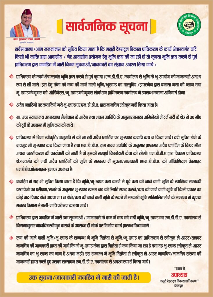 मसूरी-देहरादून विकास प्राधिकरण का प्राधिकरण क्षेत्रों में अवैध निर्माण, अवैध प्लाटिंग के खिलाफ सख्त अभियान जारी है। एमडीडीए ने नियमों की अनदेखी कर की जा रही प्लाटिंग और व्यावसायिक निर्माणों पर बड़ी कार्रवाई करते हुए कई स्थलों पर ध्वस्तीकरण और सीलिंग की कार्यवाही की। प्राधिकरण का कहना है कि मास्टर प्लान के विपरीत किसी भी गतिविधि को बर्दाश्त नहीं किया जाएगा और अभियान आगे भी जारी रहेगा।